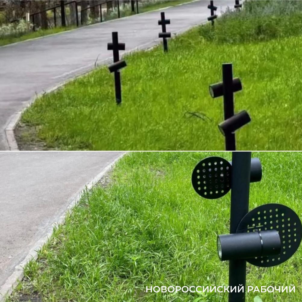 Но если все предыдущие дизайнерские ляпы можно еще как-то объяснить субъективным взглядом смотрящих, мол, люди вкладывают в фонари и скамейки смысл, которого нет, то кресты в фонарях, установленных в парке Маяковского в Екатеринбурге, не разглядел разве что незрячий.