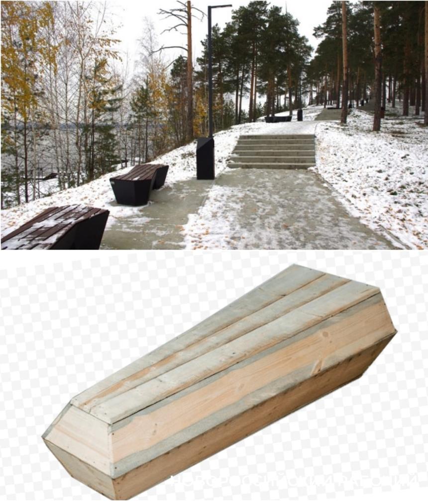 Жители Среднеуральска на прогулочной тропе вдоль Исетского озера увидели в новых лавочках очертание гробов. Ну, и конечно, рядом с «домовиной» — знакомы нам по Новороссийску и Орлу фонарь-«виселица». Гармонично.