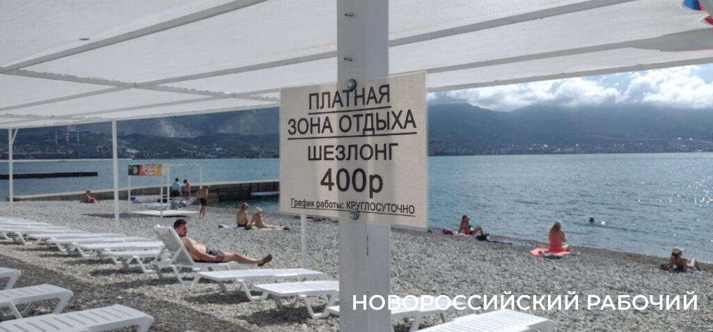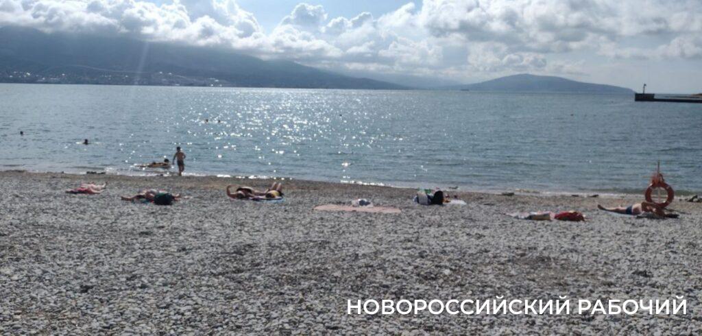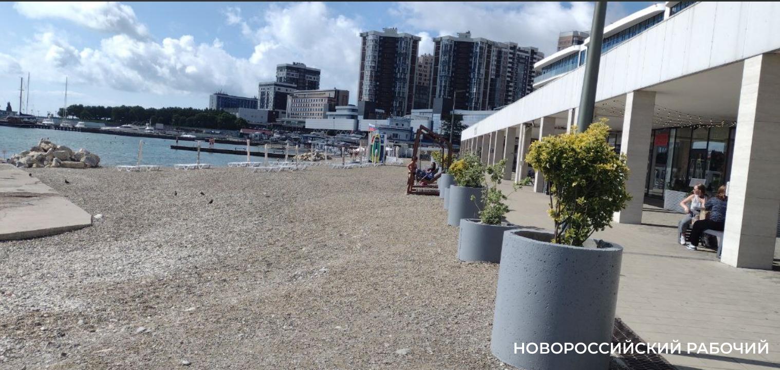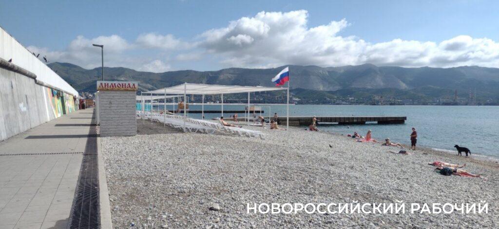 В Новороссийске пока нет настоящего летнего тепла, но народ на пляже уже отдыхает вовсю. Центральный городской пляж к приему курортников готов. Табличка на балке навеса свидетельствует, что тень здесь можно найти только за 400 рублей, правда, не указано время – на час или на весь световой день. Благодаря завезенной в прошлом году мелкой речной гальке береговая полоса стала более уютной.