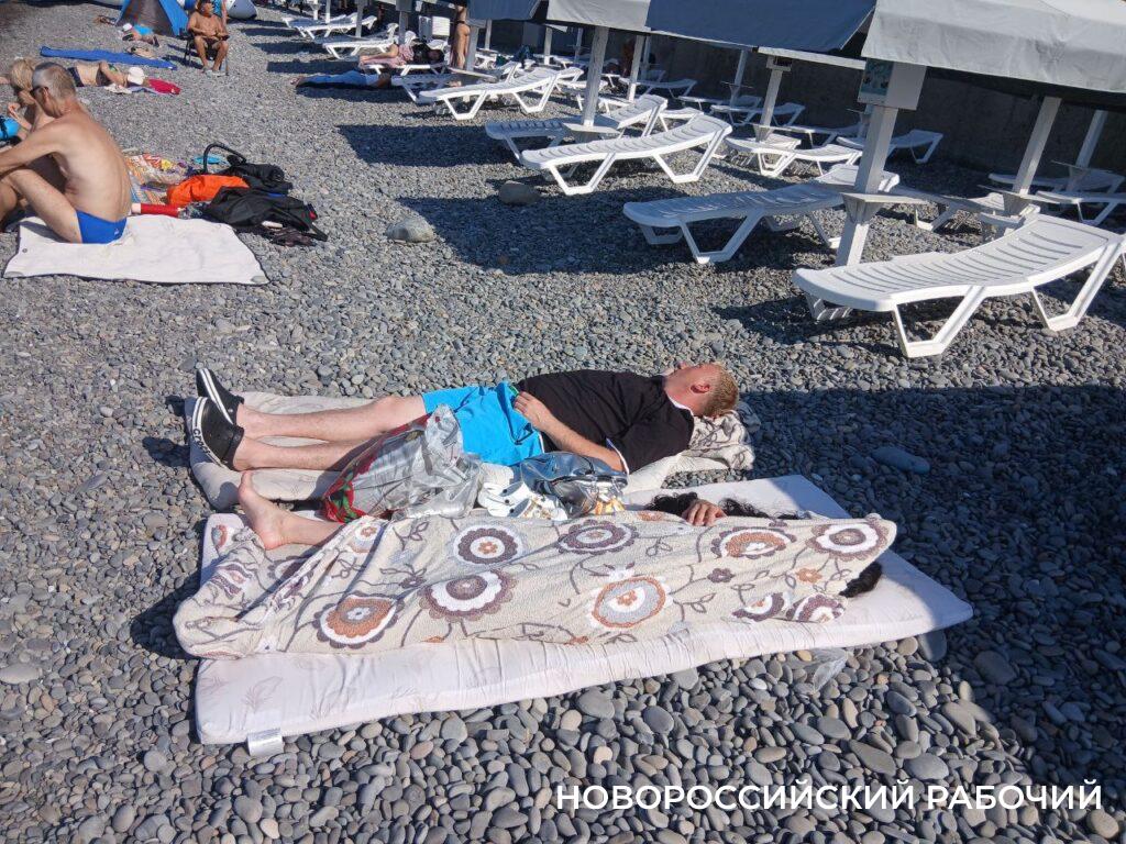 На берегу отдыхающие, придерживающиеся здорового образа жизни, ловят полезный утренний загар. Есть и пострадавшие от жаркого солнца. У некоторых пляжников уже покрасневшая с волдырями кожа. Но они пришли еще за добавкой ультрафиолета.