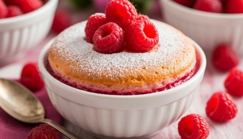 Аккуратно к белкам ввести муку и протертые ягоды. Плавными движениями перемешать все, чтобы масса оставалась пышной, только тогда рецепт приготовления малинового суфле будет правильным. Небольшие формочки тщательно промазать сливочным маслом. Выложить массу в форму и отправить в разогретую духовку. При средней температуре выпекать суфле около 13-15 минут. Перед подачей можно присыпать сверху немного сахарной пудры и украсить ягодками малины.
