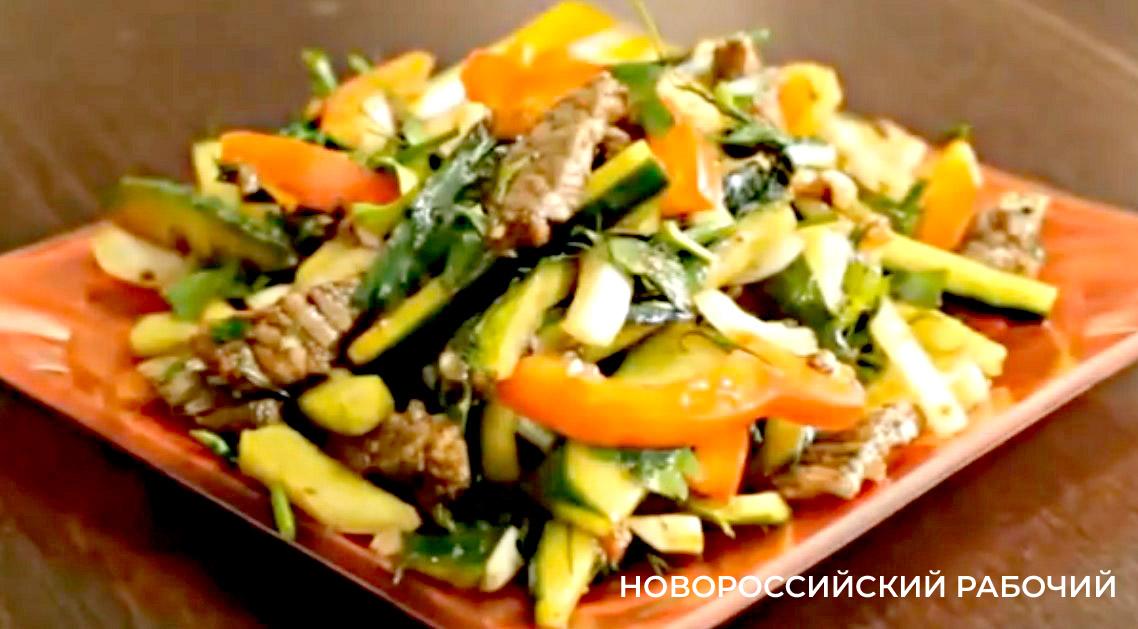 Соедините мясо с овощами и зеленью, залейте заправкой и тщательно перемешайте. Посыпьте кунжутом и подавайте сразу.