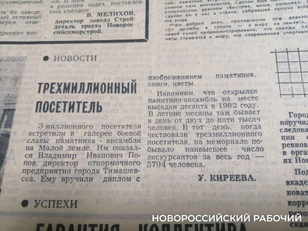 3-миллионного посетителя встретили в галерее боевой славы памятника-ансамбля на Малой земле. Им оказался Владимир Иванович Попов, директор откормочного предприятия города Тимашевска. Ему вручили диплом с изображением памятника, книги и цветы.