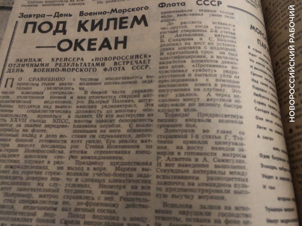 Экипаж крейсера «Новороссийск» отличными результатами встречает День Военно-Морского Флота СССР.