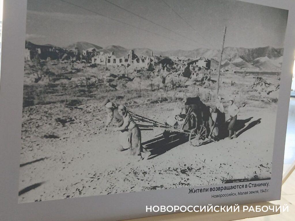 В центре всей экспозиции не случайно размещены снимки, которые сделаны в момент высадки именно 393-го батальона морской пехоты в новороссийский порт. Тут знаменитые кадры водружения знамени военно-морского флота над памятником Ленина у управления морского порта. Памятник остался цел, потому что его берегли еще во время обороны Новороссийска, обкладывали мешками с песком. Ряд фотографий показывает, каким был город после его освобождения. На фото освобожденной Станички (этот тот район, куда высаживался куниковский десант) на заднем плане нынешняя 22-я школа.