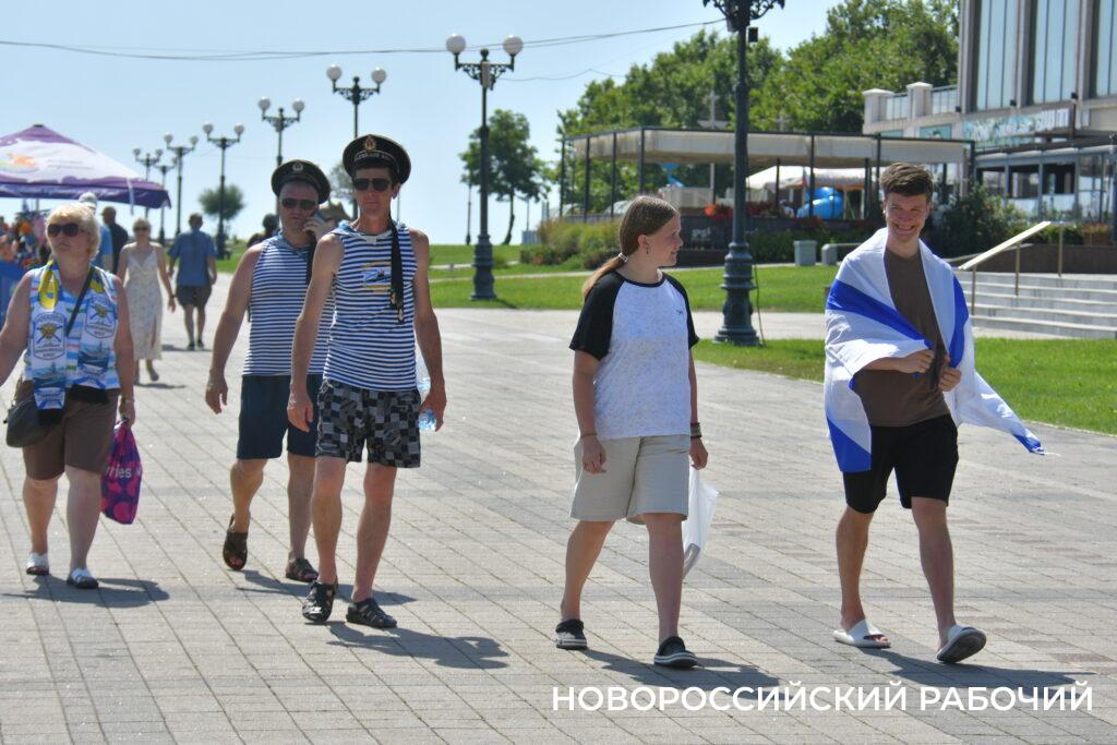 В руках у большинства — бело-голубые флаги, на бескозырках названия всех российских флотов — Черноморский, Балтийский, Тиоокеанский, даже Северный.