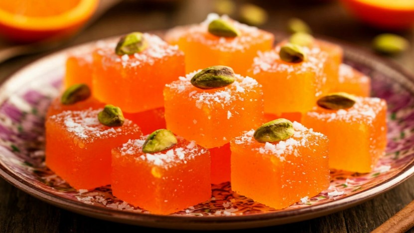 Продукты: 3 моркови (500 г), полстакана сахара (90 г), 3 ст. л. кукурузного крахмала, по желанию – ванилин или мускатный орех, для оформления готового мармелада — фисташки, кокосовая стружка.