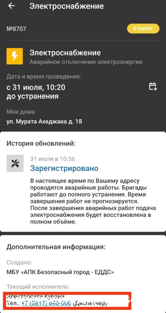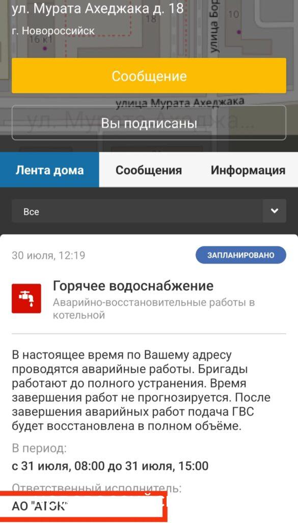 Утром, 30 июля, приложение мигнуло звездочкой на экране смартфона у жителей дома №18 по ул. Мурата Ахеджака. Уведомление было посвящено отключению горячего водоснабжения в связи с проведением аварийных работ. Исполнитель — АО АТЭК.