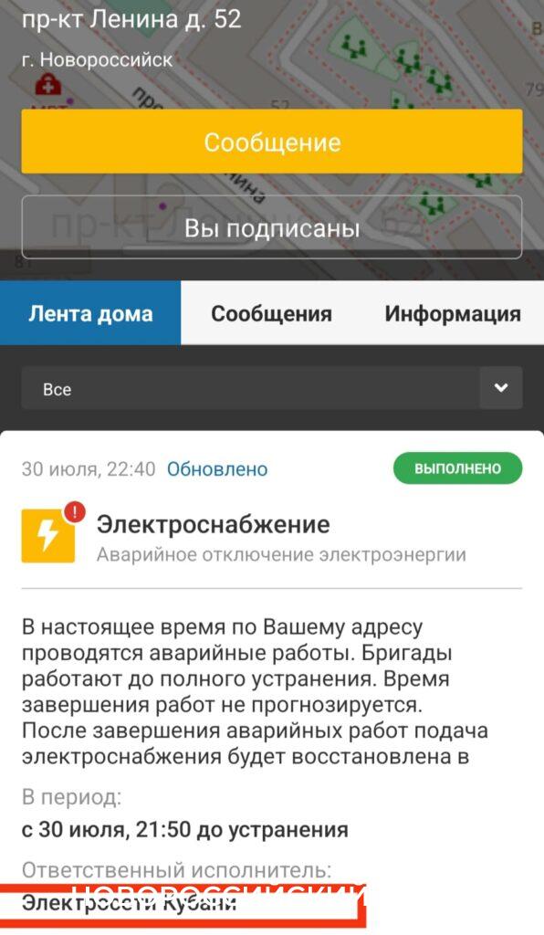 Вечером того же дня приложение «Мой-Новороссийск» озадачило жителей пр. Ленина, 52, оповестив, что электроснабжение в их доме отключилось из-за аварии на сетях «Электросети Кубани» (НЭСК). Люди удивились: свет у них есть, а вот НЭСКа — нет. После долгожданного ухода от ТЕАМ дом был переключен на сети РОСТЭК.