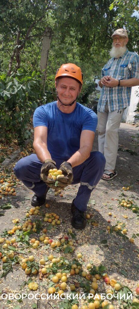 Стволы алычи разделываются на части, ветки убираются, проезд освобождается. А асфальт усеян плодами! Прохожие адекватно реагируют на эту яркую россыпь съедобного жемчуга — начинают собирать в руки, пакеты, корзинки, в рот. Замира Азизова из Узбекистана, в ярко-оранжевом халате, набрав полные ладони плодов, качает головой, сочувствуя спасателям, работающим в такое пекло. Даже ей жарковато.