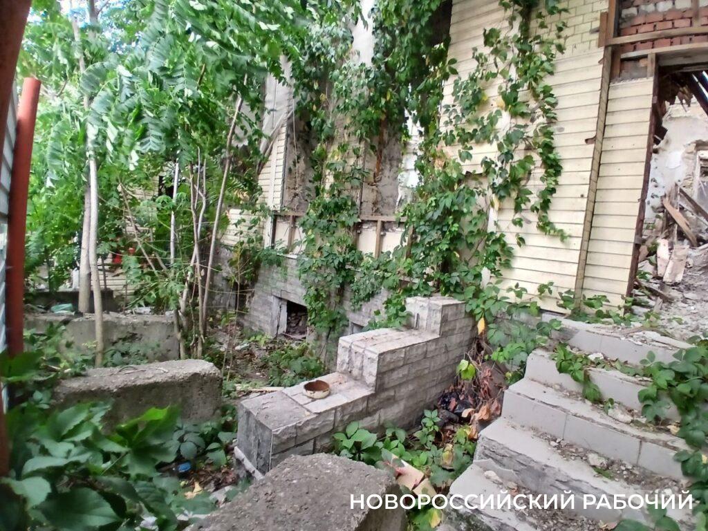 Сквозь щели забора можно разглядеть разрушенный вход в дом, забитые мусором помещения внутри. Вдоль стен валяются бутылки, использованный пластик. Явно здесь временами собираются маргинальные личности.