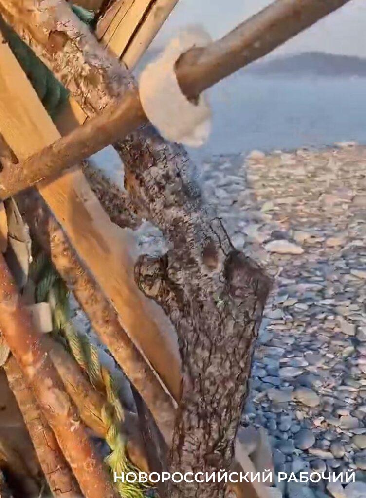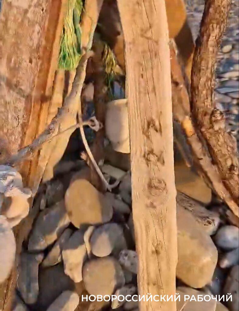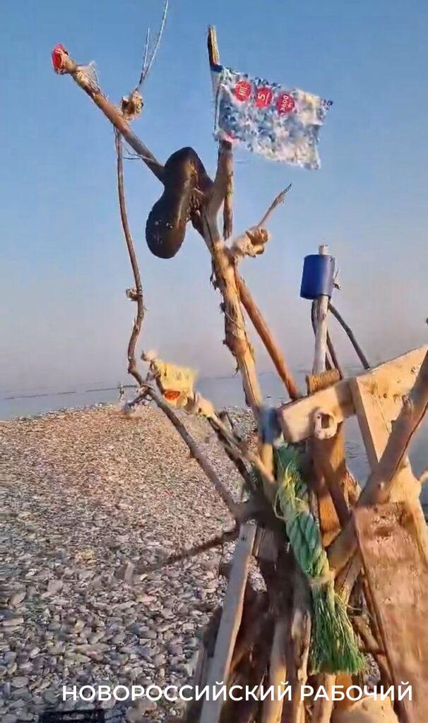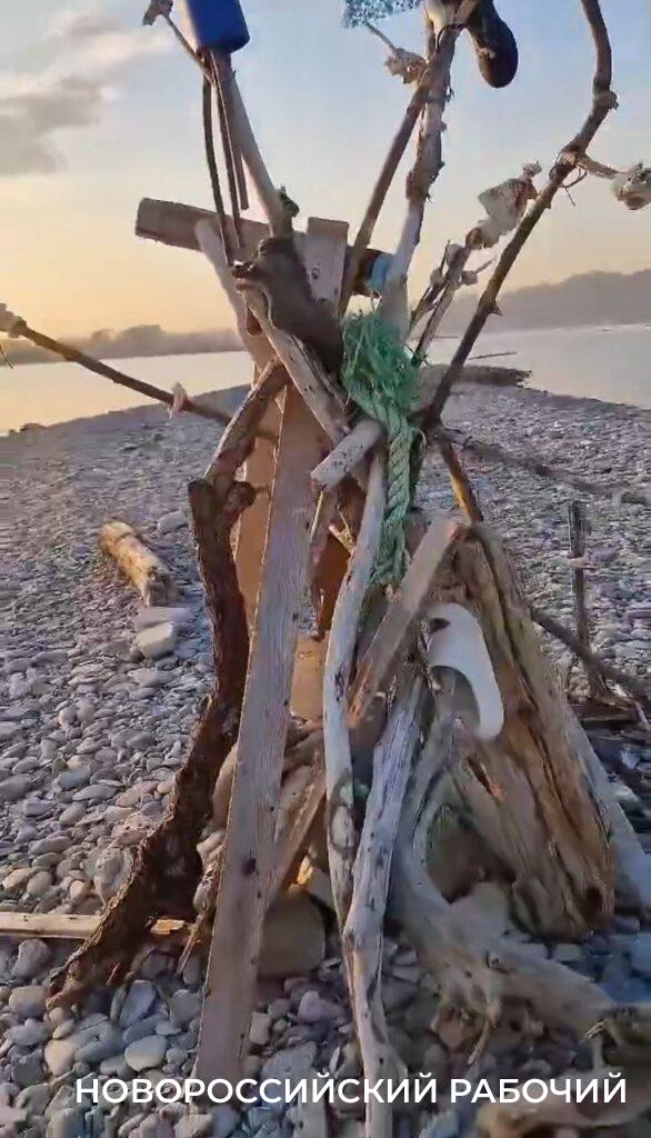 Но Андрей Свиридов на Суджуке редких птиц не увидел во время своего визита, зато его внимание привлекло сооружение, издали чем-то напоминающее вигвам или шалаш. Автор видео назвал конструкцию «обелиском». Ее построил кто-то неизвестный из того, что попалось под руку на пустынном острове. А под руку попались ветки, которые долго находились в воде и были вынесены на берег, строительная каска, ботинки, рваные шлепанцы, высушенная рыба-игла и другие отходы, которые оставляют после себя люди. На верху «шалаша» трепетал какой-то флажок из обрывков, кажется полиэтилена. Неизвестный зодчий использовал мусор, который попадает в море.