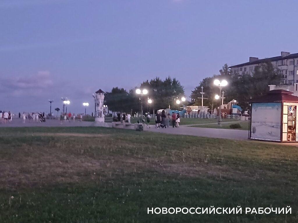 Еще пару недель назад по набережной в обе стороны двигался нескончаемый поток отдыхающих, состоящий из  курортников и местных. Лился он в обе стороны, захватывая газоны – там располагались целыми компаниями. Сейчас тоже можно встретить желающих полежать на травке, но их стало меньше, ведь земля уже не такая теплая. А вот владельцам собак, кажется, ничего не мешает гулять в зеленой зоне.