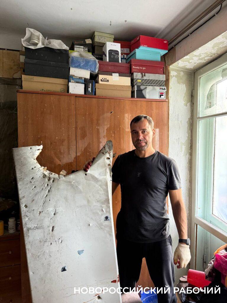 В этом доме сильно пострадала квартира на втором этаже. Хозяин — Павел Калабухов, рассказал «Новороссийскому рабочему», что он и его сын каким-то невероятным чудом не получили ранения. Снаряд влетел в комнату через окно, а мужчина в это время стоял у шифоньера. Взрыв разнес холодильник, телевизор, газовую плиту, нагревательный бак, кухонную мебель, посуду, стены и потолок комнаты в дырах от металлических элементов, которыми был начинен дрон, оконные стекла выбиты. Шифоньер тоже весь в шрамах от шрапнели, в металлической раме велосипеда зияет большая дыра. А вот хозяин квартиры не получил ни одного серьезного ранения!