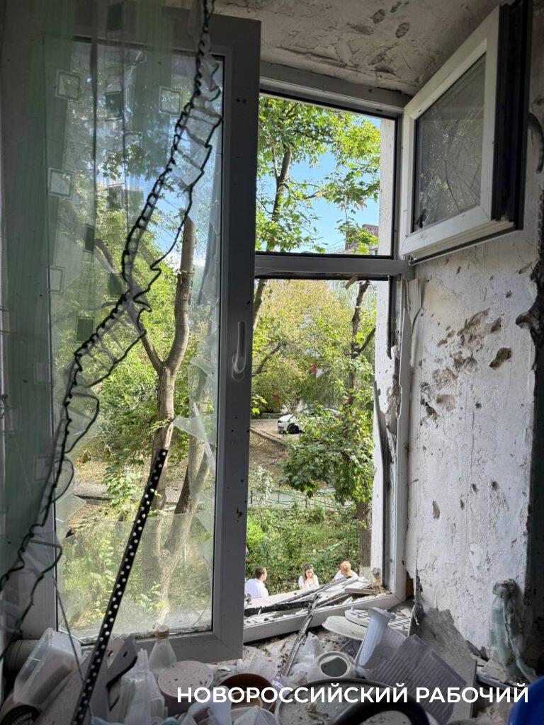 В этом доме сильно пострадала квартира на втором этаже. Хозяин — Павел Калабухов, рассказал «Новороссийскому рабочему», что он и его сын каким-то невероятным чудом не получили ранения. Снаряд влетел в комнату через окно, а мужчина в это время стоял у шифоньера. Взрыв разнес холодильник, телевизор, газовую плиту, нагревательный бак, кухонную мебель, посуду, стены и потолок комнаты в дырах от металлических элементов, которыми был начинен дрон, оконные стекла выбиты. Шифоньер тоже весь в шрамах от шрапнели, в металлической раме велосипеда зияет большая дыра. А вот хозяин квартиры не получил ни одного серьезного ранения!