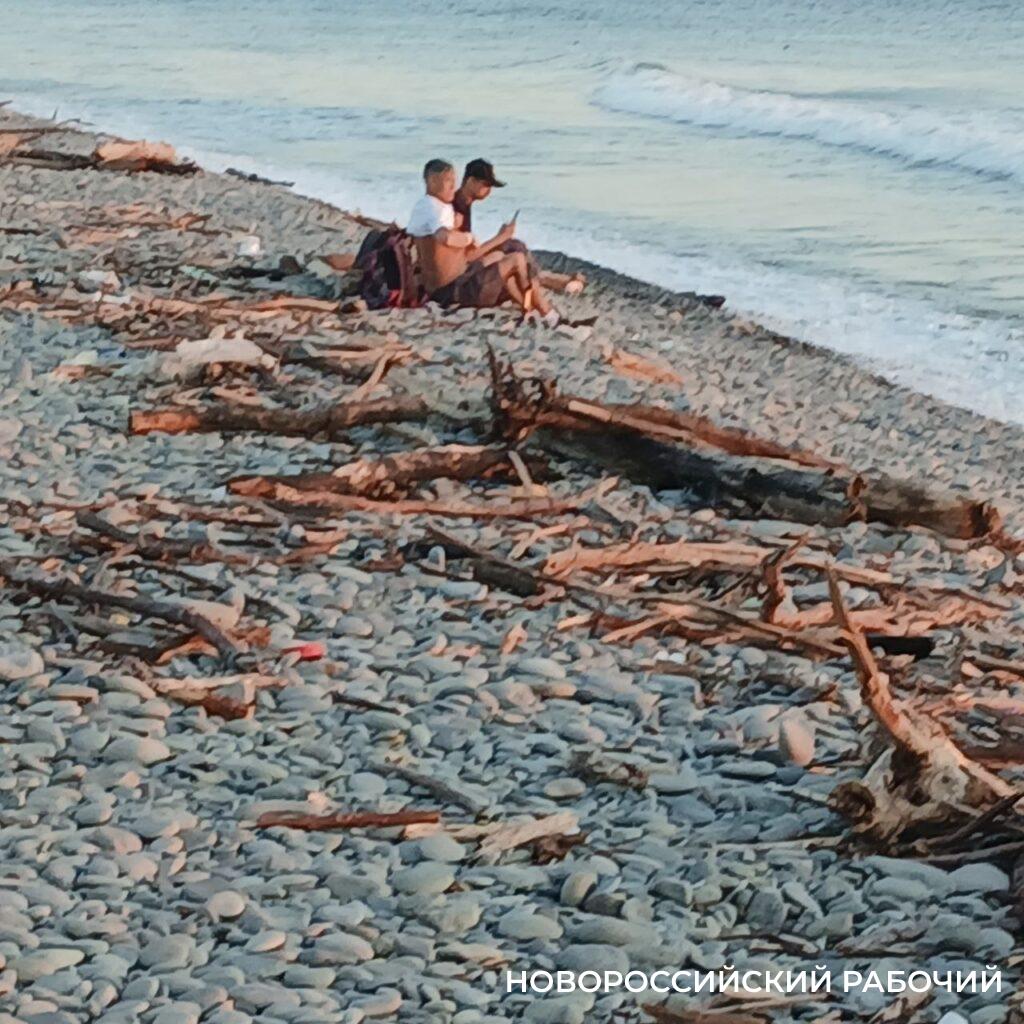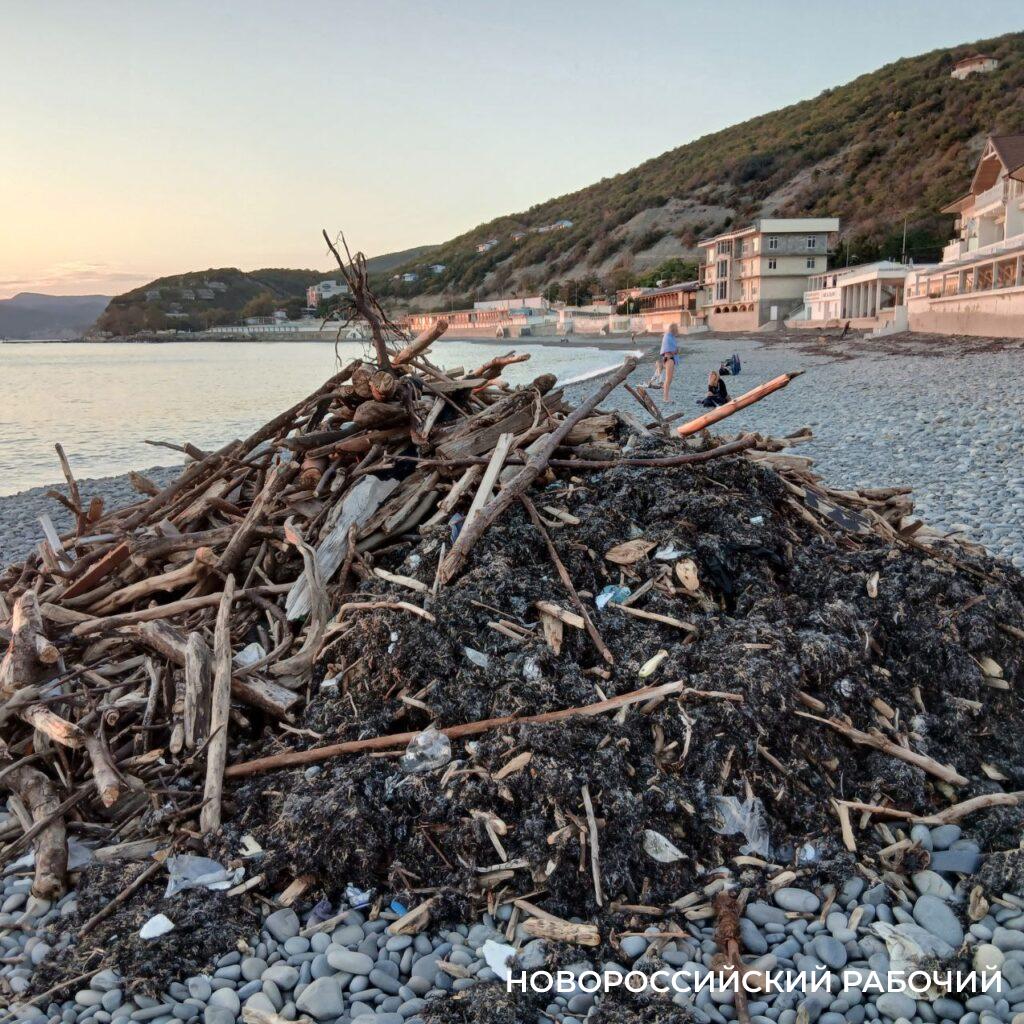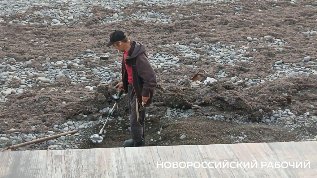 Пляж в Широкой балке чистят. На берегу собрали целую гору из принесенных морем веток и стволов. Рядом еще одна гора из подсохших водорослей. А по тем водорослям, что еще не сгребли в общую кучу, ходит «кладоискатель» с металлодетектором. Ищет человек потерянные курортниками сережки, монеты и что-то другое.