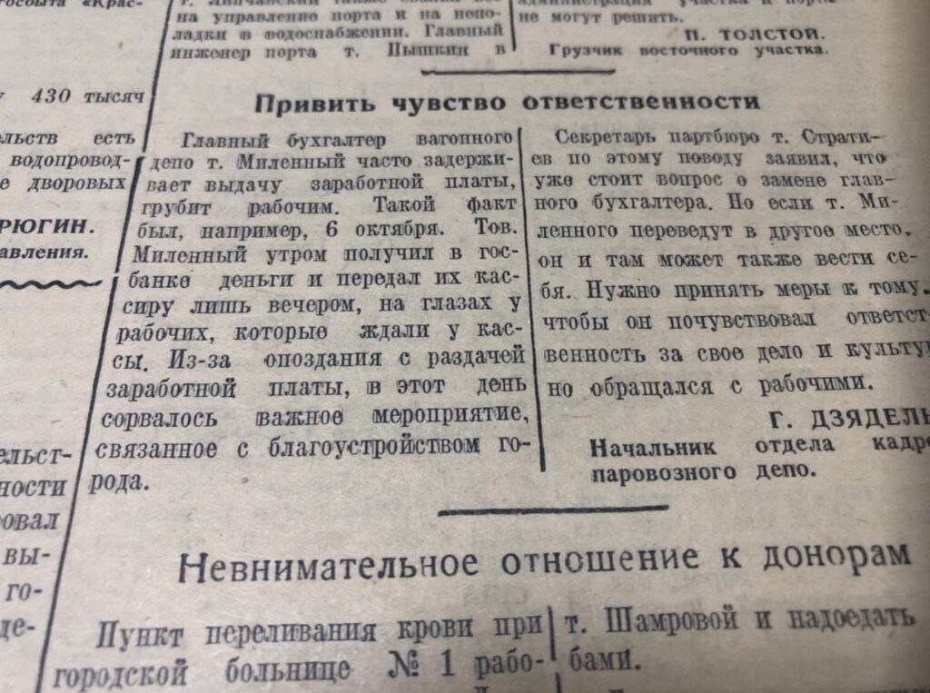 Главный бухгалтер вагонного депо т. Милленко часто задерживает выдачу заработной платы, груб с рабочими. Такой факт был, например, 6 октября. Т. Милленко утром получил в Госбанке деньги и передал их кассирше лишь вечером, на глазах у рабочих, которые ждали у кассы.