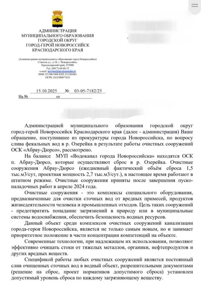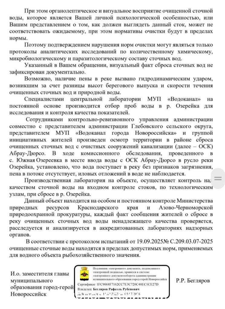 В ответ на одну из жалоб и.о. замглавы администрации Рафаэль Бегляров уверял местную жительницу, что «специалистами центральной лаборатории МУП «Водоканал» на постоянной основе производится отбор проб воды в р. Озерейка для исследования и контроля качества показателей». Тогда, в середине сентября, после обращения этой гражданки на место «ввода воды с ОСК (очистных сооружений канализации) Абрау-Дюрсо в русло реки Озерейка» выходила комиссия и установила, что вода поступает без признаков загрязнения, пена в потоке отсутствует, иловых отложений не наблюдается. И результаты испытаний от 19 сентября, подтвердили, что «очищенные сточные воды находятся в пределах допустимых норм, применяемых для водного объекта рыбохозяйственного значения».