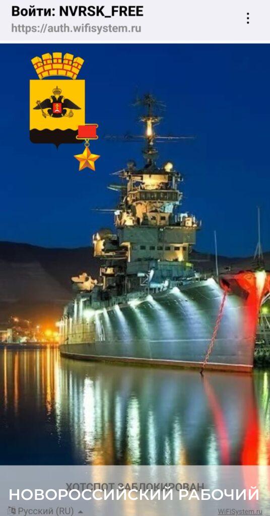 Двое молодых людей, ожидавших троллейбус, подсказали, что та самая сеть, которая предусмотрена разработчиками «умной» остановки скорее всего называется NVRSK_FREE. Она приглашала войти в систему без всяких условий. После клика предстала красивая картинка с гербом города-героя, крейсером “Михаил Кутузов” и надписью “Хотспот заблокирован”. То есть, когда-то тут предоставляли вай-фай, но не теперь.