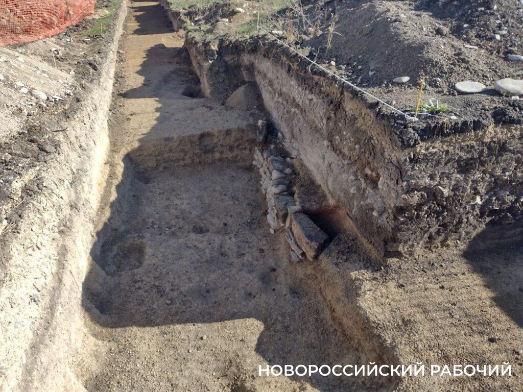 Что еще раскопали археологи за последние недели? Ученые начали работать в месте, где пройдет траншея для будущего освещения реконструируемого мемориального комплекса «Малая земля». Как раз тут располагалась южная стена древней крепости «Суджук-кале». Вот и новая находка — раскопали полноценное жилище с уцелевшими фрагментами стены, хозяйственной ямой, очагом. Вдоль северо-восточной стены замечают необычные выемки. Александр говорит, что это следы от стоявших там высокогорлых сосудов с маслом, зерном, вряд ли с вином, ведь хозяевами были турки. В южной части замечаю какую-то странную каменную кладку. Археолог предполагает, что это фальшстена, которую сложили, чтобы поддержать от разрушения основную стену, размываемую водой.
