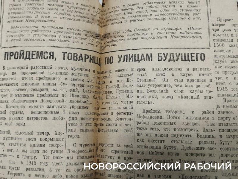 Будущее Новороссийска в наших руках. Дальнейший расцвет нашей жизни зависит от нас самих. Приложим все силы и способности, чтобы в новом, 1946 году ускорить возрождение любимого Новороссийска».
