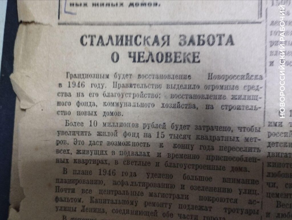 В 1946 году мы сделаем большой шаг в этом деле. По инициативе товарища Сталина правительство приняло решение о восстановлении 15 крупнейших и старейших русских городов. В их число включен и Новороссийск. Программа восстановительных и строительных работ поистине грандиозна… Новороссийцы получат десятки тысяч квадратных метров новых благоустроенных квартир, новые очаги культуры и просвещения, поликлиники и больницы, новые бытовые предприятия. Расширится и будет лучше удовлетворять запросы жителей электрификация, водоснабжение, внутригородской транспорт…