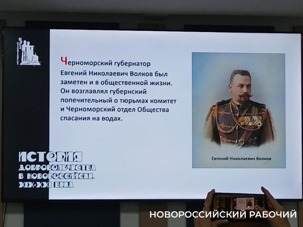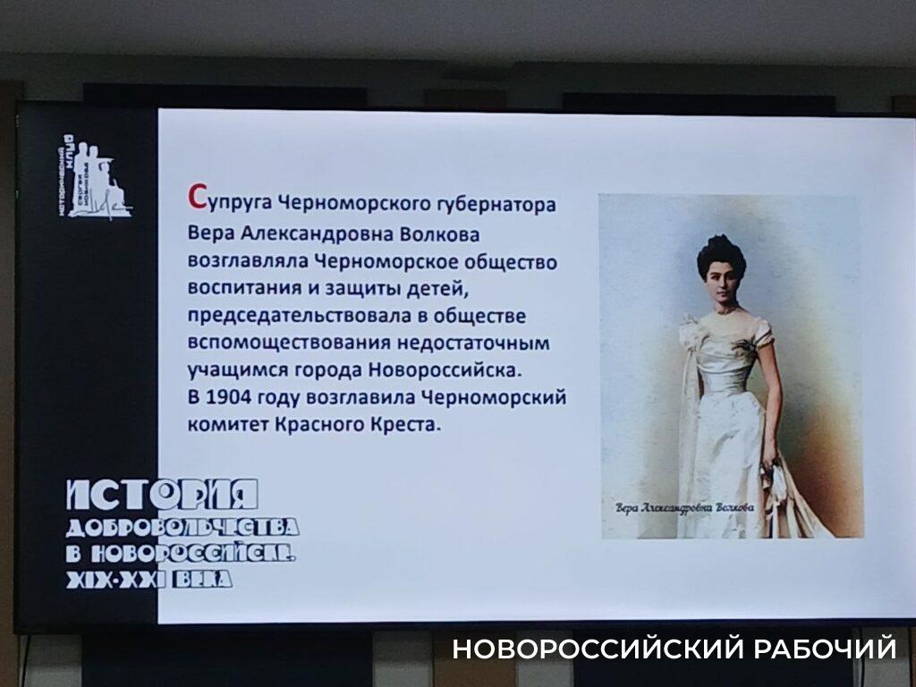 Супруга черноморского губернатора Вера Александровна Волкова стояла во главе и «Черноморского общества воспитания и защиты детей», председательствовала в обществе «Вспомоществования недостаточным учащимся города Новороссийска». Недостаточные учащиеся – это те, в чьих семьях было недостаточно средств. Вера Волкова курировала все, что связано с детством. В 1904 году она возглавила комитет «Красного креста».