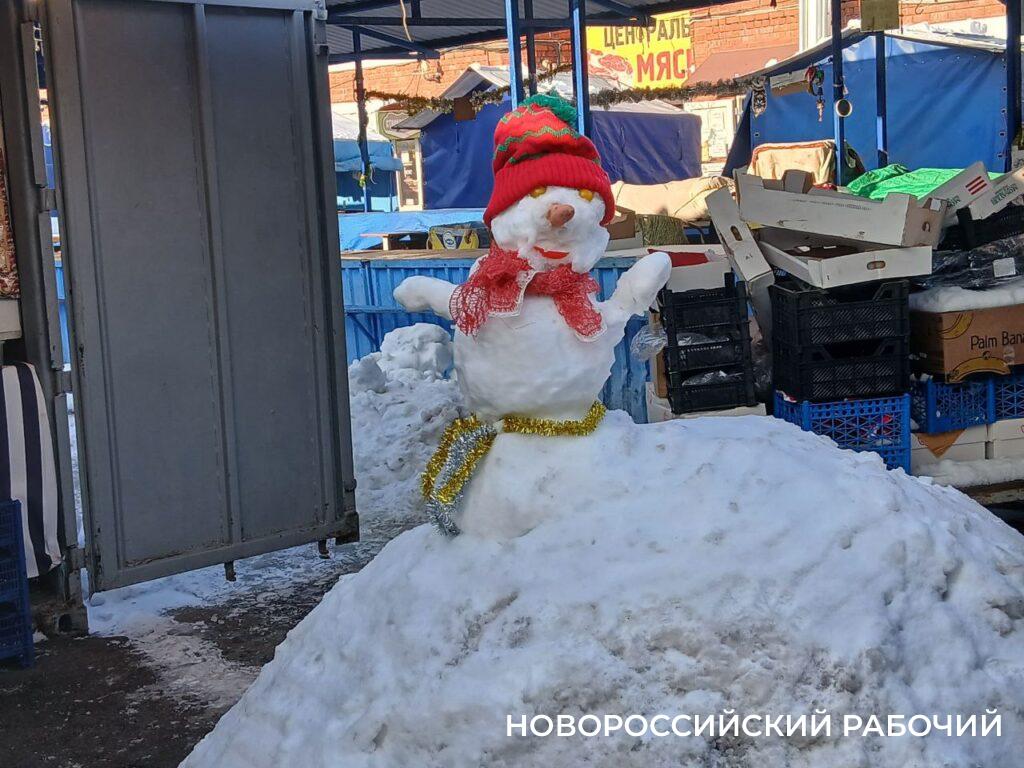 Идеально прочищен тротуар в мини-скверике рядом с ювелирной мастерской. А на Бирюзова очень скользко. Чтобы дойти до аптеки или до рынка, желательно ступать не по тротуарам, а по газонам, где снег рыхлый. Территория центрального рынка очищена, но не до конца. На куче снега, который сгребли в одно место, стоит снежная баба.