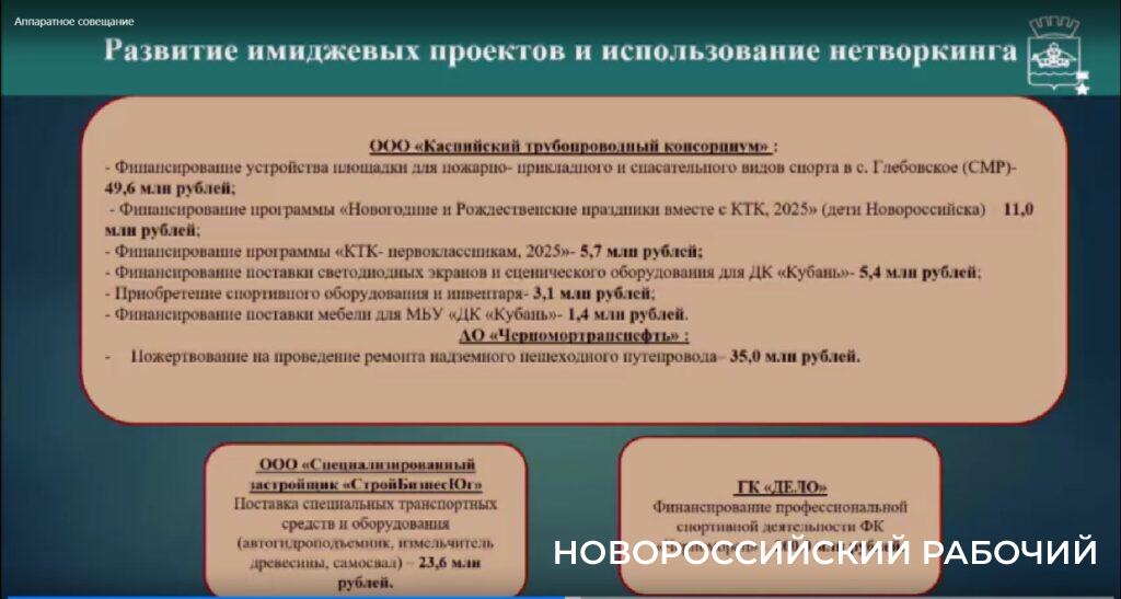 В числе основных благотворителей — ГК «Дело», вложившая в развитие новороссийского футбола 200 млн. руб. Большую поддержку городу оказал КТК-Р – более 76 млн. руб. Самым дорогостоящим его проектом стала площадка для развития пожарно-прикладных видов спорта в селе Глебовское. Еще одно градообразующее предприятие АО «Черномортранснефть» пожертвовало на ремонт надземного путепровода 35 млн. руб. ООО «Специализированный застройщик «СтройБизнесЮг» финансировал приобретение автогидроподъемника, измельчителя древесины, самосвала для муниципалитета, выделив 23,6 млн. руб.