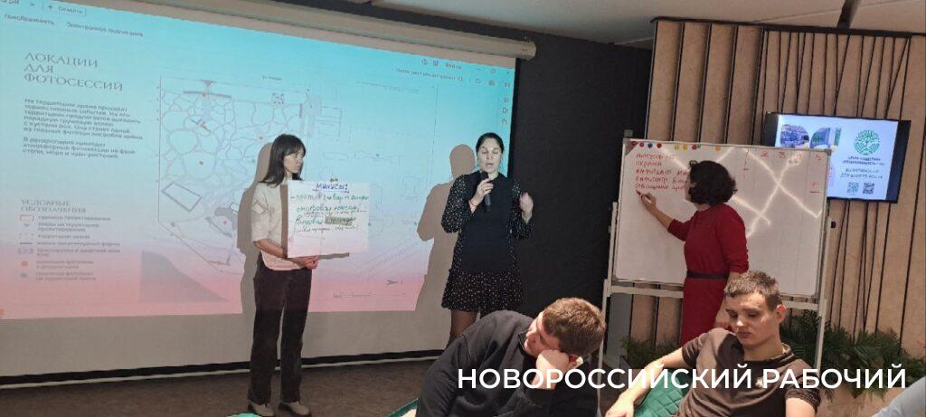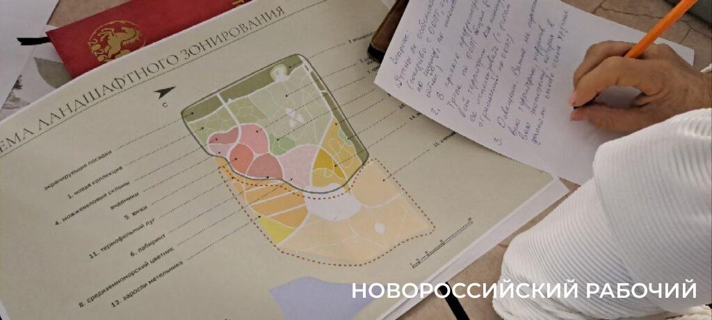 Ничего принципиально в новой схеме не поменялось: в Дендропарке появится, если верить картинке, входная группа, видовая площадка, зеленый лабиринт, эко-павильон, амфитеатр и сцена, смотровая консоль и смотровая вышка. Из нового – свадебная грушевая аллея (звучит очень вкусно) и фотозона. Горожанам, пришедшим на слушания и разбившимся на команды, предположили обсудить обновленную схему и внести свои предложения. Я подсела к столику с новороссийскими общественными активистами.