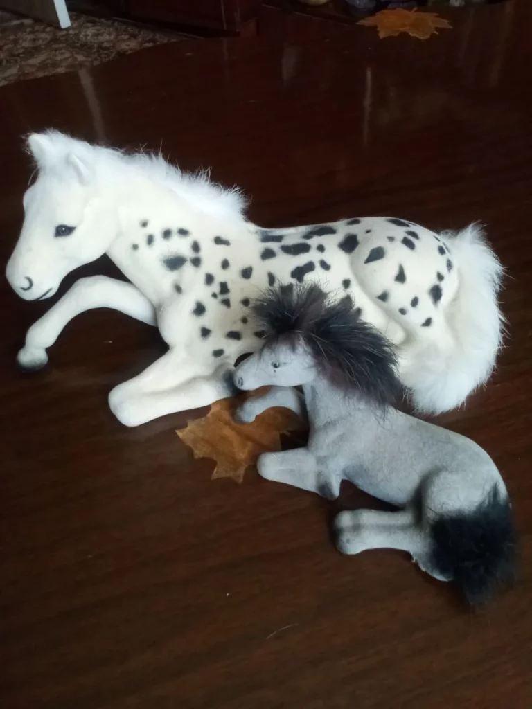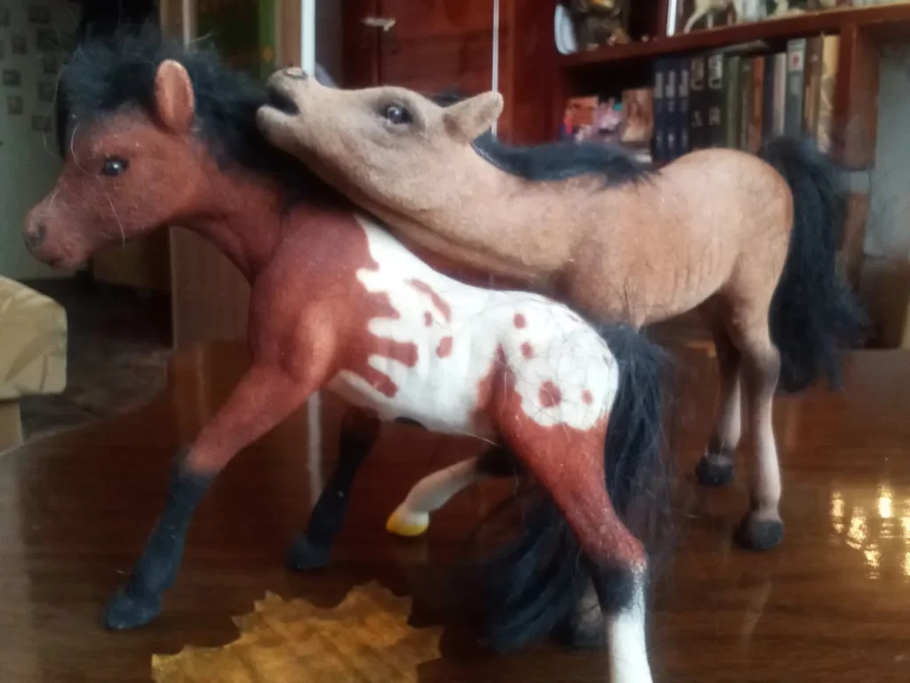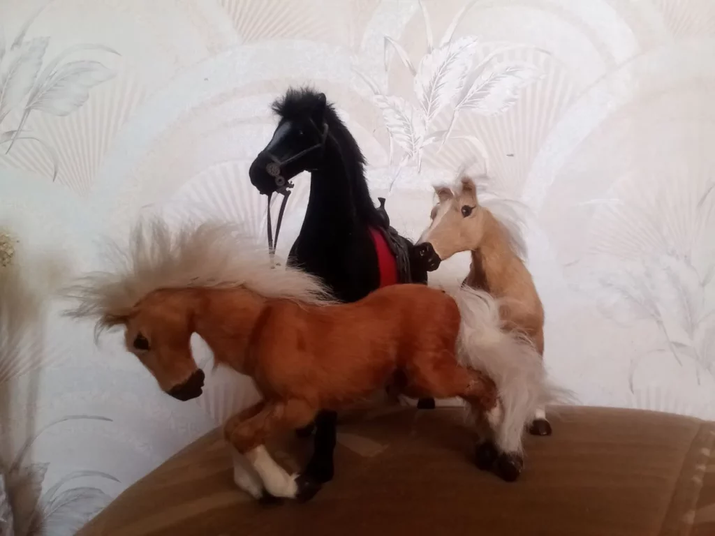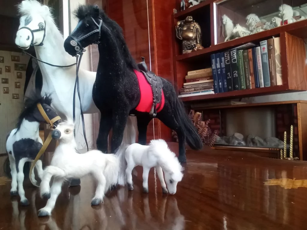 Красных лошадок в коллекции нет, но остальные масти присутствуют – белые, мышастовые, в яблоках, каурые, гнедые, чубаровые. Под седлом и с уздечкой и без. У всех длинные гривы и хвосты, которые можно причесывать.