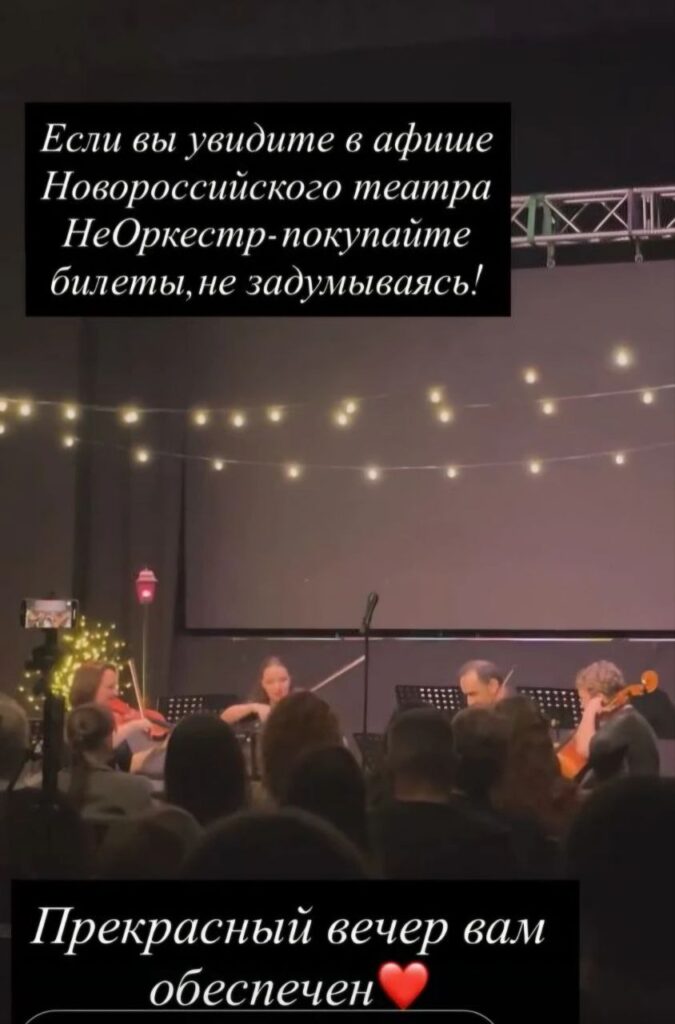 — Коллектив собрался из моих друзей из городов, что поблизости от Новороссийска. Все было просто: «Хочешь поиграть – хочу»! И так набралось 20 человек без гарантии гонорара. Я арендовала зал в ГДК и билеты продались мгновенно. Теперь мы «НЕ оркестр». А также мы не квартет, не ансамбль, мы содружество музыкантов, которые прекрасно проводят время. Этот концерт – марш энтузиастов, концерт по любви. Музыканты на этом концерте заработали на шоколадку, и я надеюсь, что это только начало.