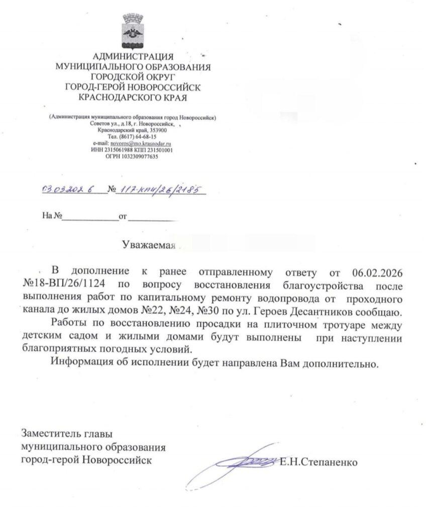 О том, что после капитального ремонта водопровода от проходного канала к домам №22, 24, 30 по ул. Г. Десантников провалилось плиточное покрытие, «Новороссийский рабочий» писал. Тогда на обращение горожанки заместитель главы Екатерина Степаненко сообщила, что плитку восстановят до 1 марта.