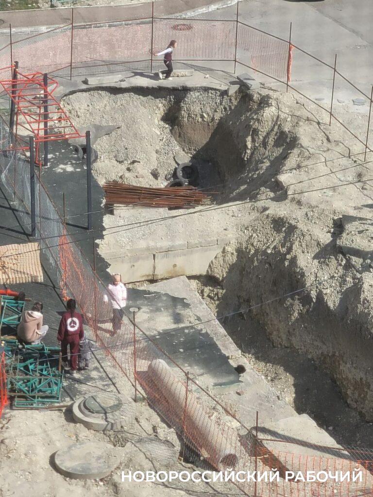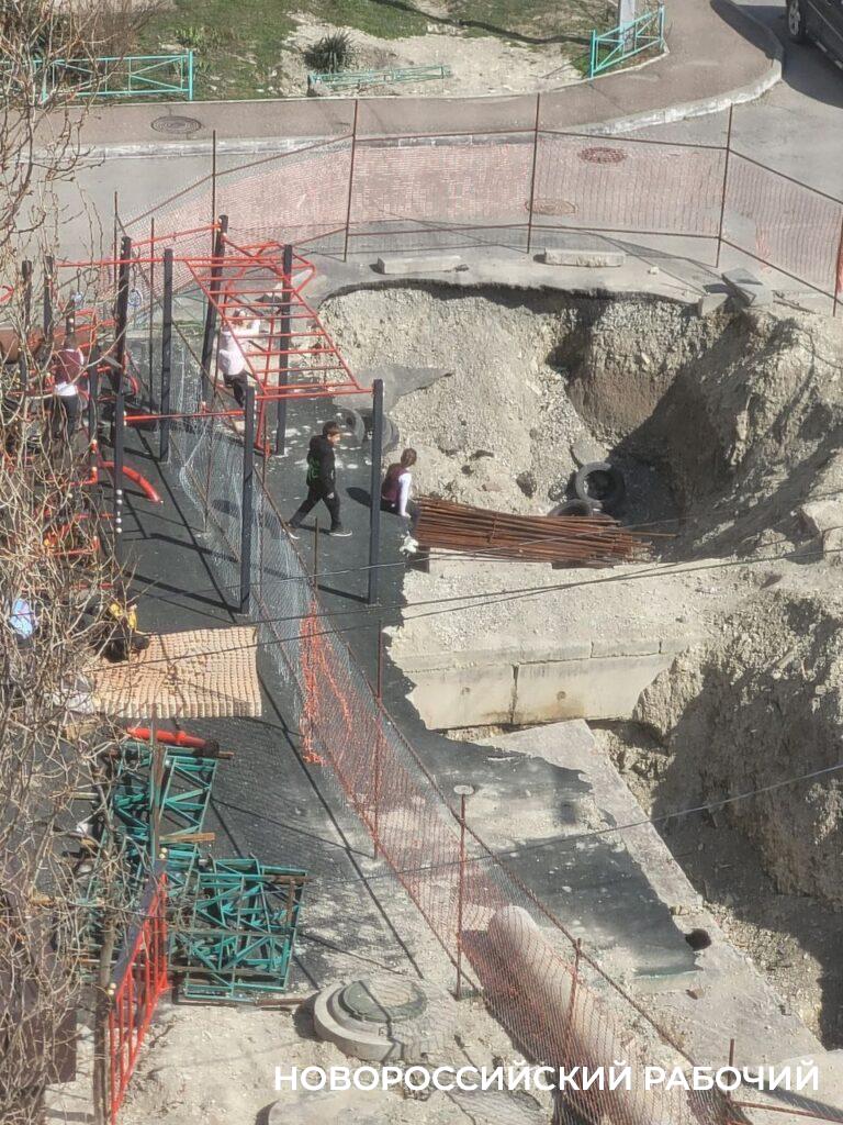 Как только поставили забор, дети стали перебираться через него по турникам. Понятно, что они смотрят на это препятствие как своеобразный аттракцион. Очень травмоопасный. Очевидица выложила фото, на нем видно, как школьники ходят по большой трубе, сидят на краю траншеи рядом с арматурой.
