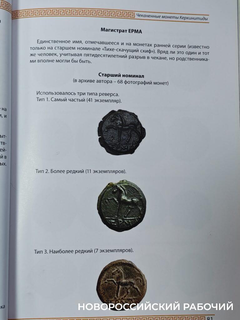 Кроме того, Олег Довельман предполагает, что он сделал в своей книге несколько шагов вперед в изучении нумизматики Керкинитиды: опубликовал фото монет, не введенных в научный оборот, и выявил новый тип монет, определив хронологию смены магистратов. В любом случае его открытие должны оценить ученые. Дождемся крымской конференции по нумизматике.
