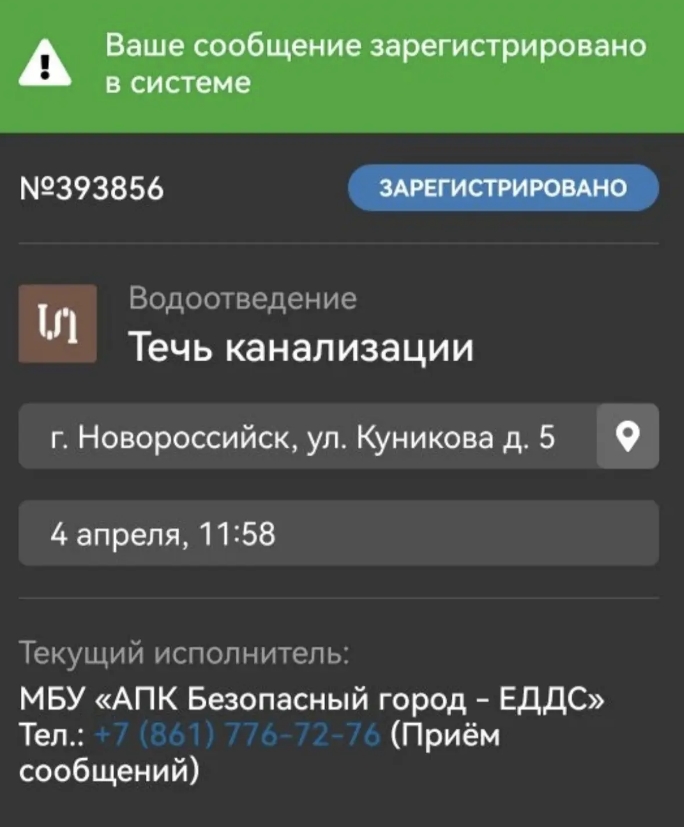 Последняя авария произошла 4 апреля. Старшая дома сообщила об этом в аварийно-диспетчерскую службу УК, а также оставила обращение в приложении «Мой город Новороссийск».