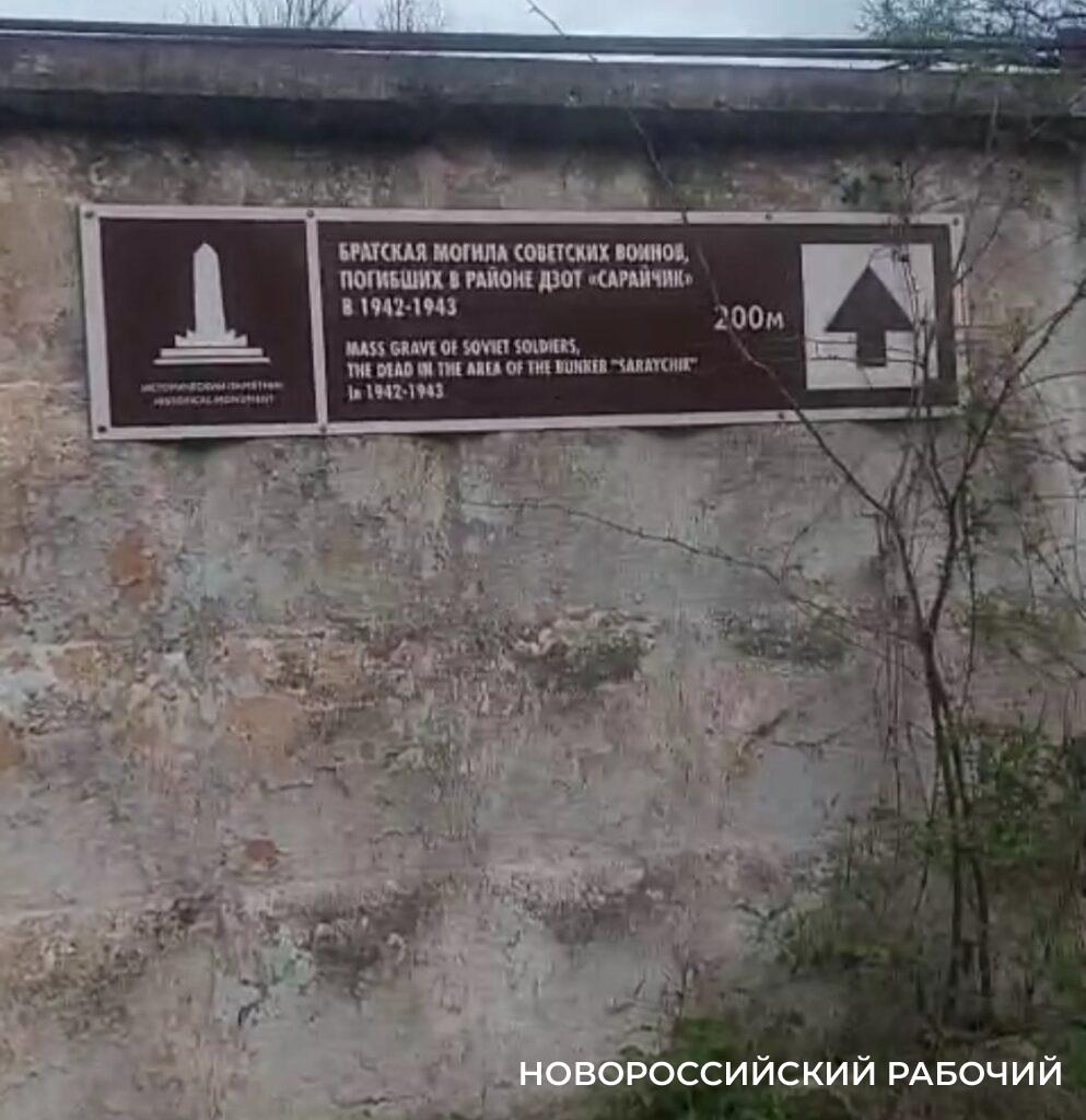 Речь о «Братской могиле советских воинов, погибших в районе дзота «Сарайчик» в 1942–1943 году», которая находится на территории промышленного предприятия. В ней захоронены останки более 3 тысяч защитников Новороссийска. Скульптурная композиция, открытая в апреле 1957 года, посвящена подвигу бойцов, которые стояли на линии фронта и не дали фашистам продвинуться вперед.