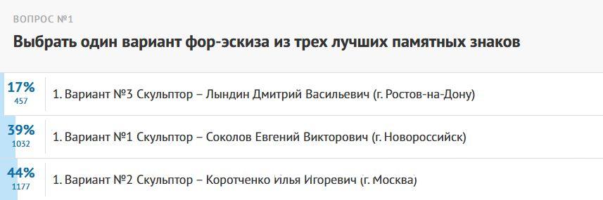 В итоге проголосовали 2666 человек. За вариант скульптора из Ростова-на-Дону отдали голоса 24 процента проголосовавши, за работу Евгения Соколова, скульптора из Новороссийска – 38 процентов.