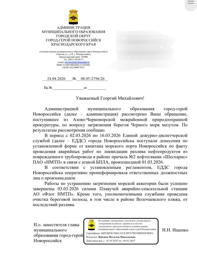 Что касается администрации города, то там, как выяснилось, о мазуте на Волочаевском берегу были в курсе. «В период с 02.03.2026 по 16.03.2026 Единой дежурно-диспетчерской службой (далее – ЕДДС) города Новороссийска поступали донесения по установленной форме от капитана морского порта Новороссийск по факту проведения аварийных работ по ликвидации разлива нефтепродуктов из поврежденного трубопровода в районе причала No2  нефтегавани «Шесхарис» ПАО «НМТП» в связи с атакой БПЛА, произошедшей 01.03.2026», ответила и.о. замглавы Наталья Ищенко.