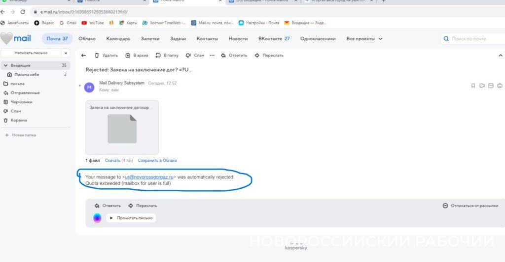 В суть его вникла с помощью гугловского переводчика: «Ваше сообщение было автоматически отклонено: превышена квота (почтовый ящик пользователя заполнен)».