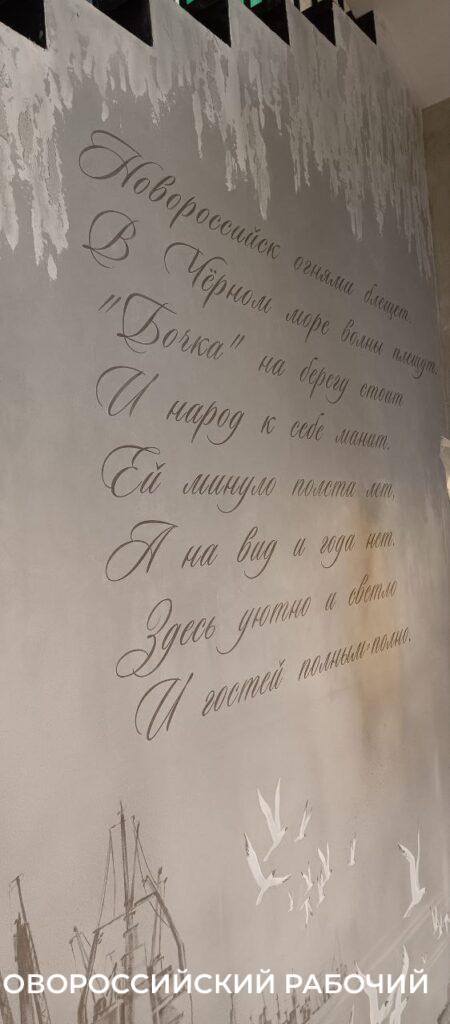 В зале есть два любопытных исторических стенда – на них фотографии «Бочки» разных времен, которые принесли сюда горожане. На них – отцы, бабушки, тети и дяди. Они ходили и любили ту «Бочку», теперь сюда будут ходить их дети и внуки. Преемственность поколений, генетическая память. Эмоции и теплота, которая не стерлась с годами. Под наплывом таких эмоций новороссийская поэтесса Галина Катрачева написала стихотворение, посвященное «Бочке». Оно длинное, поэтому на одной из стен кафе написали первые два четверостишия.