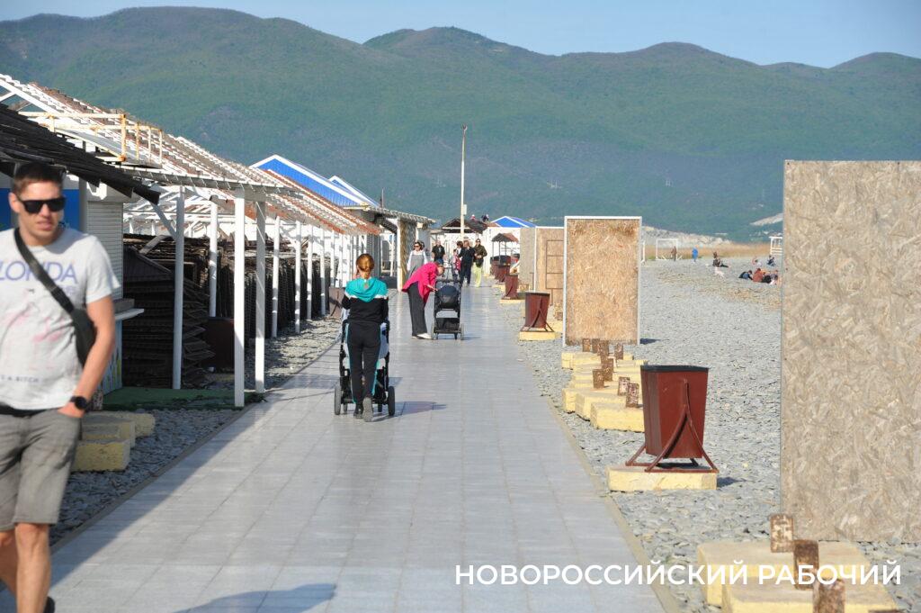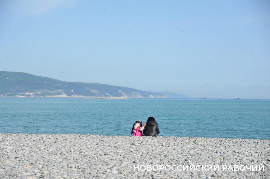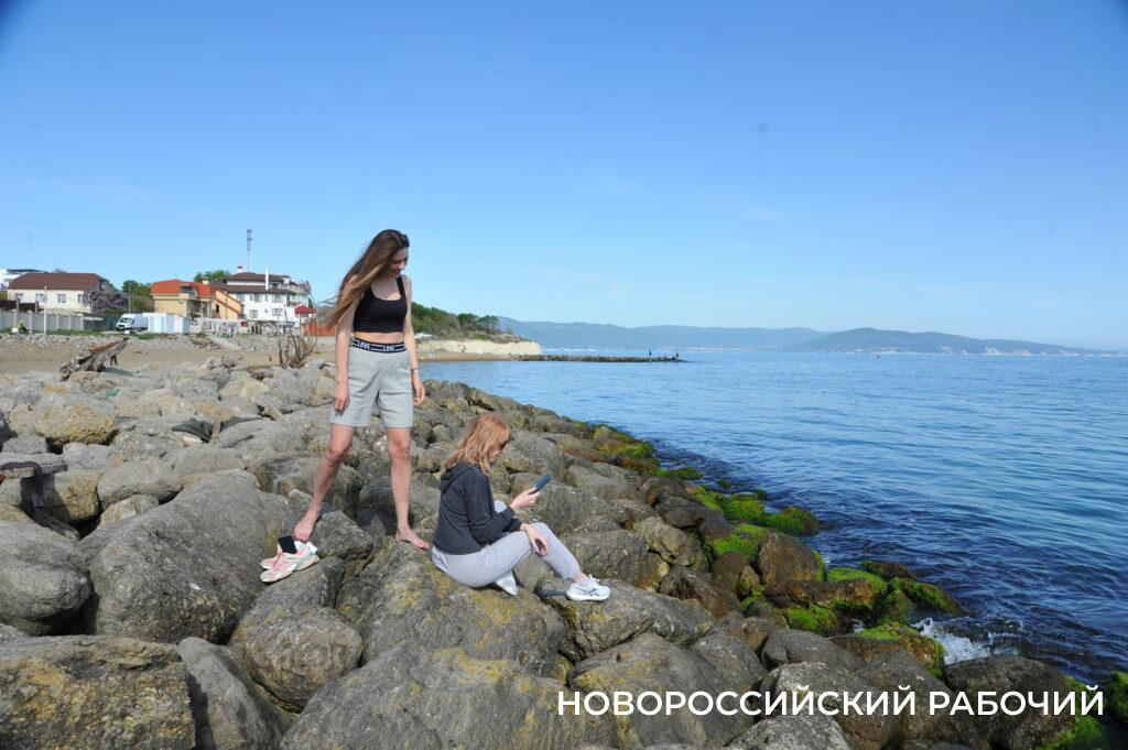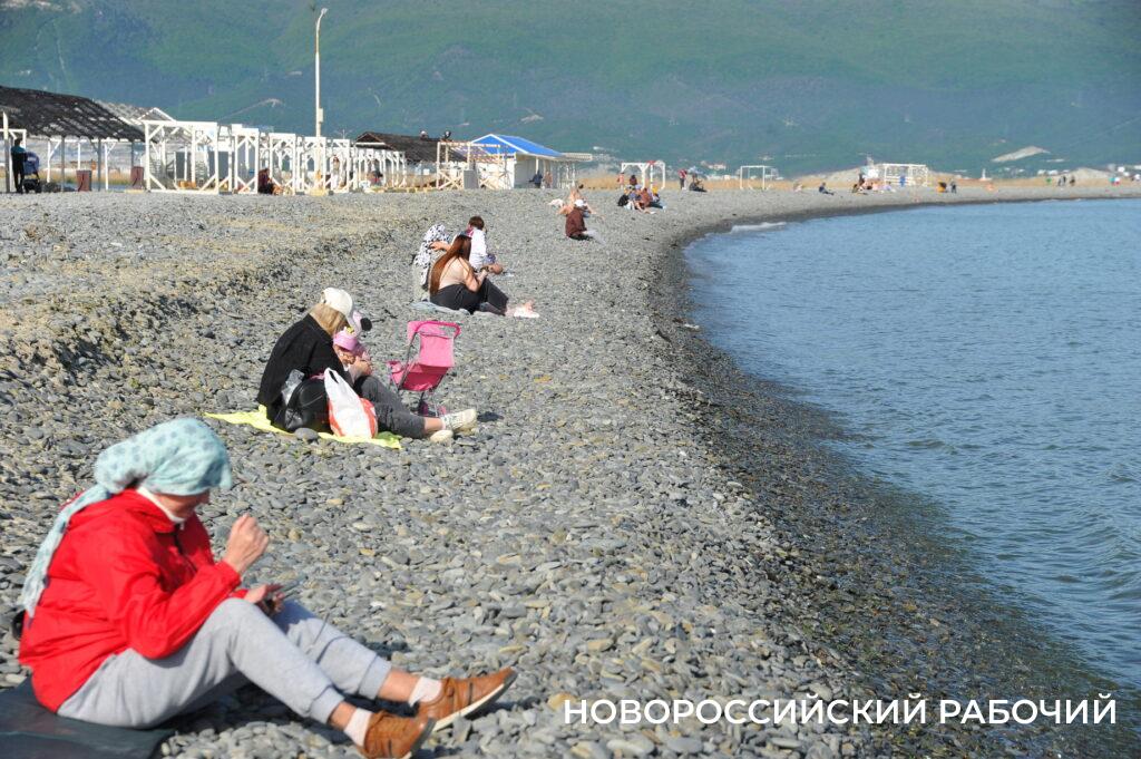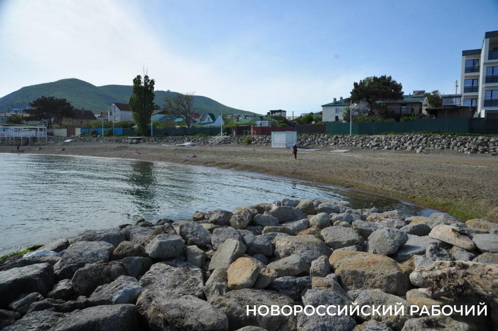 Берег моря в Мысхако в середине рабочего дня не пустует, насчитываю 26 компаний отдыхающих. Хотя никакой курортной инфраструктуры пока нет. Рабочие только собирают деревянные зонтики, чинит их после «шторма века». Рядом с берегом склад из брошенных целлофановых пакетов с хламом. Раздевалки уже стоят. Щебень, сбитый штормом в гору, пока не выровнен, приходится ползти в горку. Замечаем двух парней, один в плавках, сейчас полезет в воду. И точно, молодой человек заходит в воду и, погрузившись по шейку, сидит там.