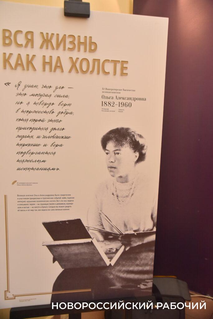 Выставка, посвященная княгине Ольге в нашем музее, подготовлена историко-культурным центром «Дворцовый комплекс Ольденбургских» к 140-летию со дня рождения великой княгини Ольги Александровны. Любители истории смогут прочесть письма Ольги Александровны к брату — императору Николаю II и племянницам, дневниковые записи и мемуары. Здесь можно узнать подробности жизни «последней великой княгини России», запечатленные с самого ее детства.