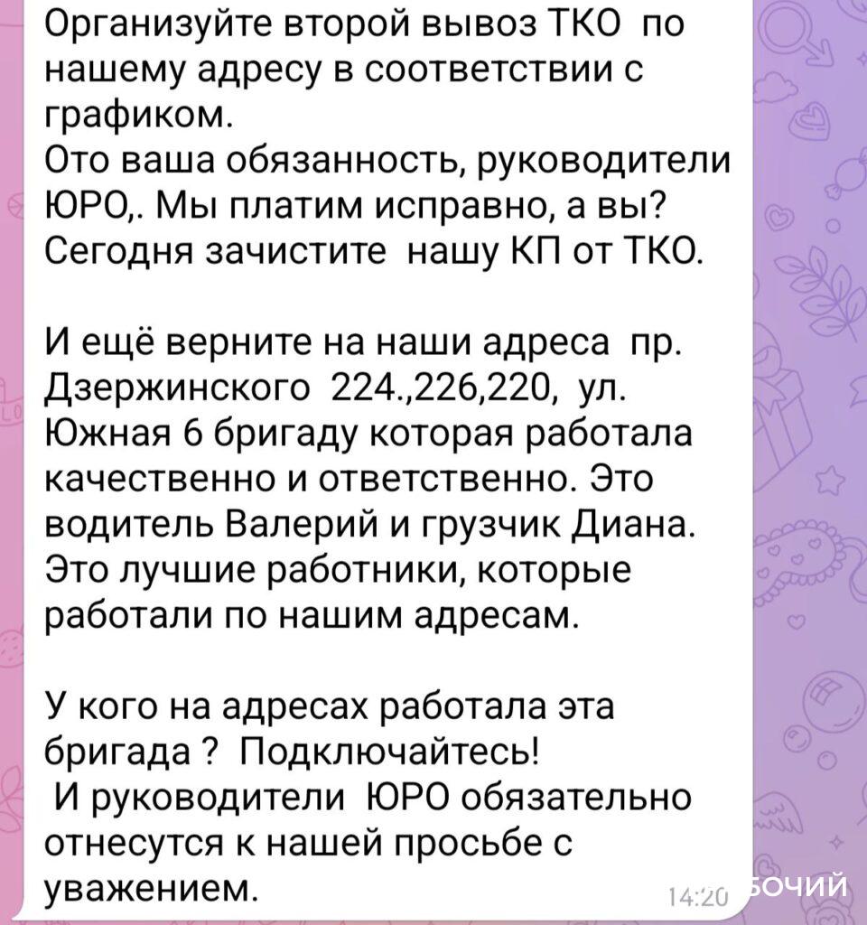 Печально, что когда кругом говорят о нехватке рабочих рук, региональный оператор так поступает с сотрудниками. Команда водителя Валерия и грузчика Диана была на своём месте. Верните нам, пожалуйста, эту команду. Она нужна нашему Южному району.